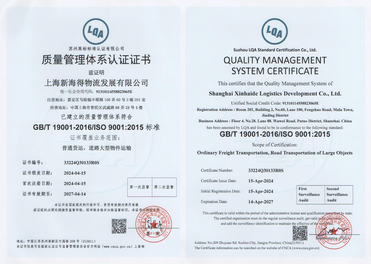 新海得物流嚴格按現代物流操作流程進行標準化運作。已通過國際質量管理體系ISO9001:2015體系認證。運用健全的客戶服務管理系統、車輛管理系統,財務管理系統。在查詢、監控、追蹤、結算等方面與客戶做到無縫對接,打造了專業高效的客戶服務體系。